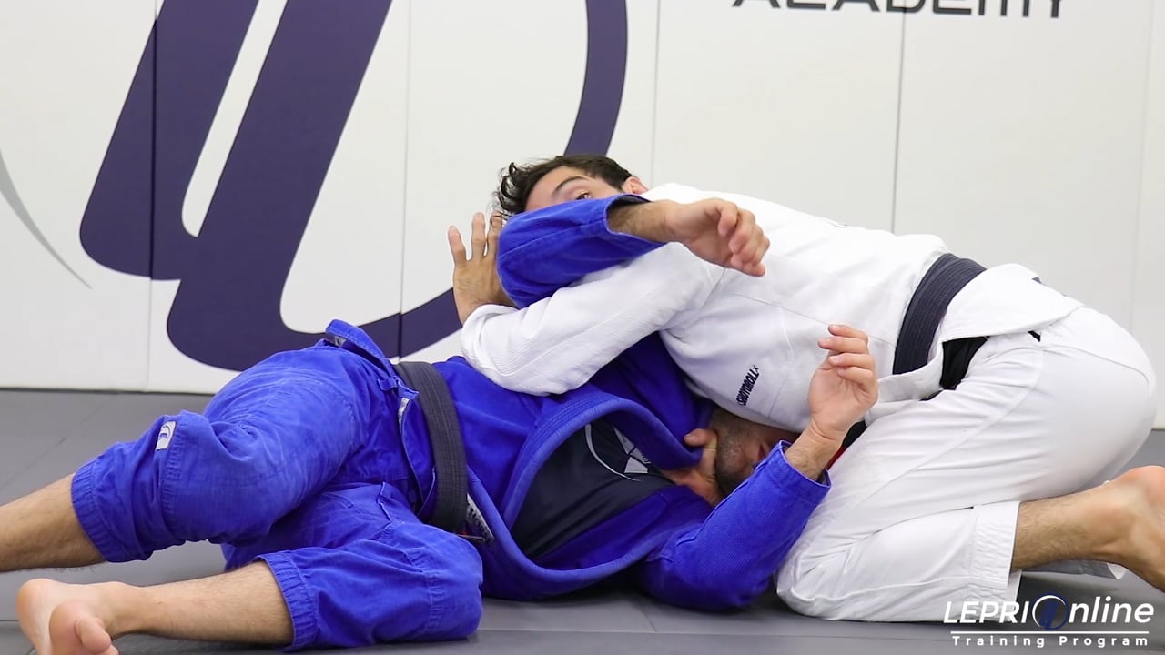 Professor Lucas Lepri shows to get a collar choke when the opponent goes from the De La Riva to the sit up guard. The opponent starts with the De La Riva and tries to sit up and push Lucas. Lucas pushes the opponent back and as soon as the opponent reacts by coming back up, Lucas loops his arm around the opponent’s neck. He now forward rolls and pulls his elbow in to get the choke. In this scenario, Lucas isn’t able to finish the choke from that position. Instead, he rolls to the other side releasing the pant grip and goes for the under hook. From this position Lucas can now finish the choke, or he can also mount the opponent for the choke.