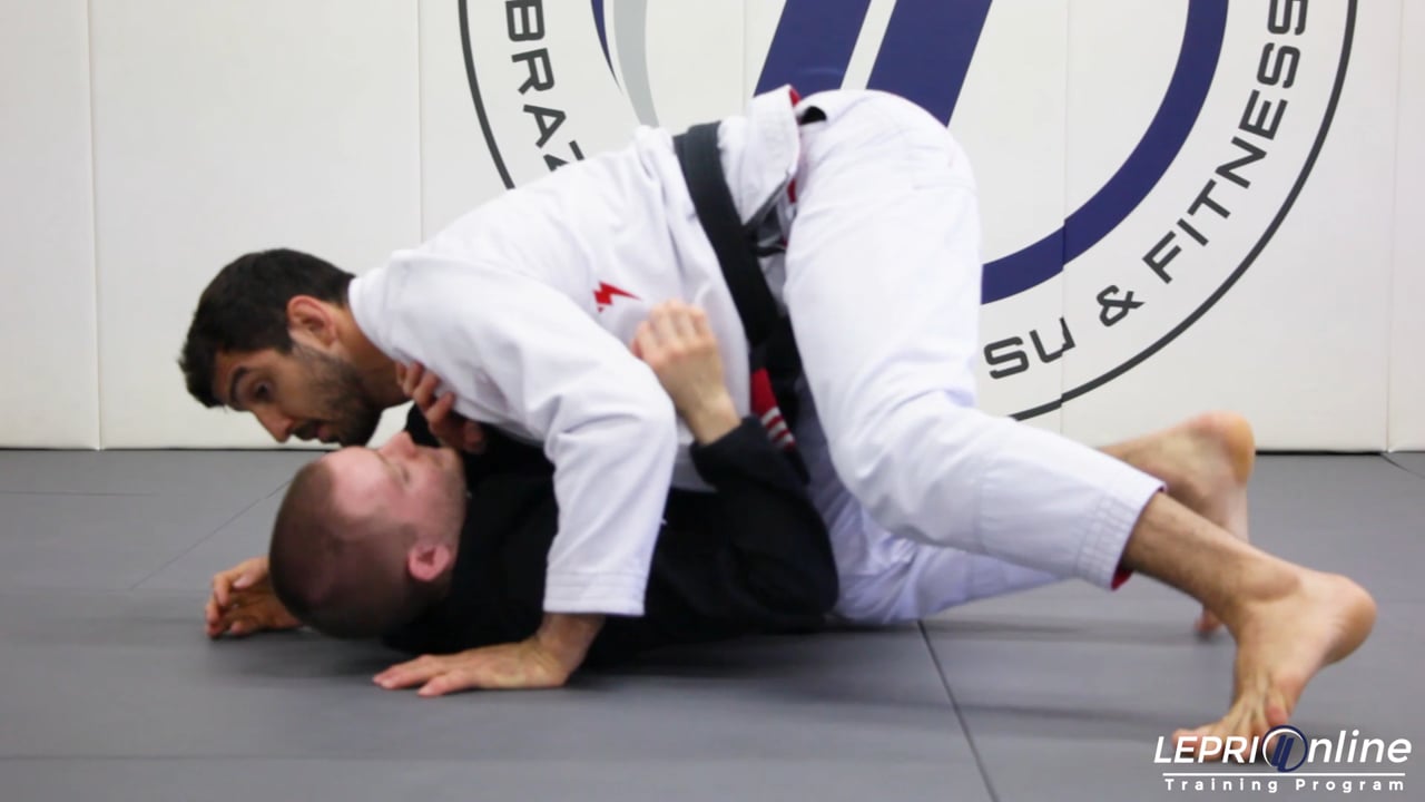 Professor Lucas Lepri shows another method for getting to the knee cut pass when an opponent plays sit up guard. In this situation, the opponent traps Lucas’ ankle with his legs. Lucas blocks the opponent’s knee and steps his free leg back to the other side of the opponent, sitting with his full weight on the opponent. Lucas grips the opponent’s collar with his thumb down, continuing to push the opponent’s knee down. From there, Lucas steps back across the opponent’s body, using his forearm under the opponent’s chin to execute the knee cut pass and establish side control.