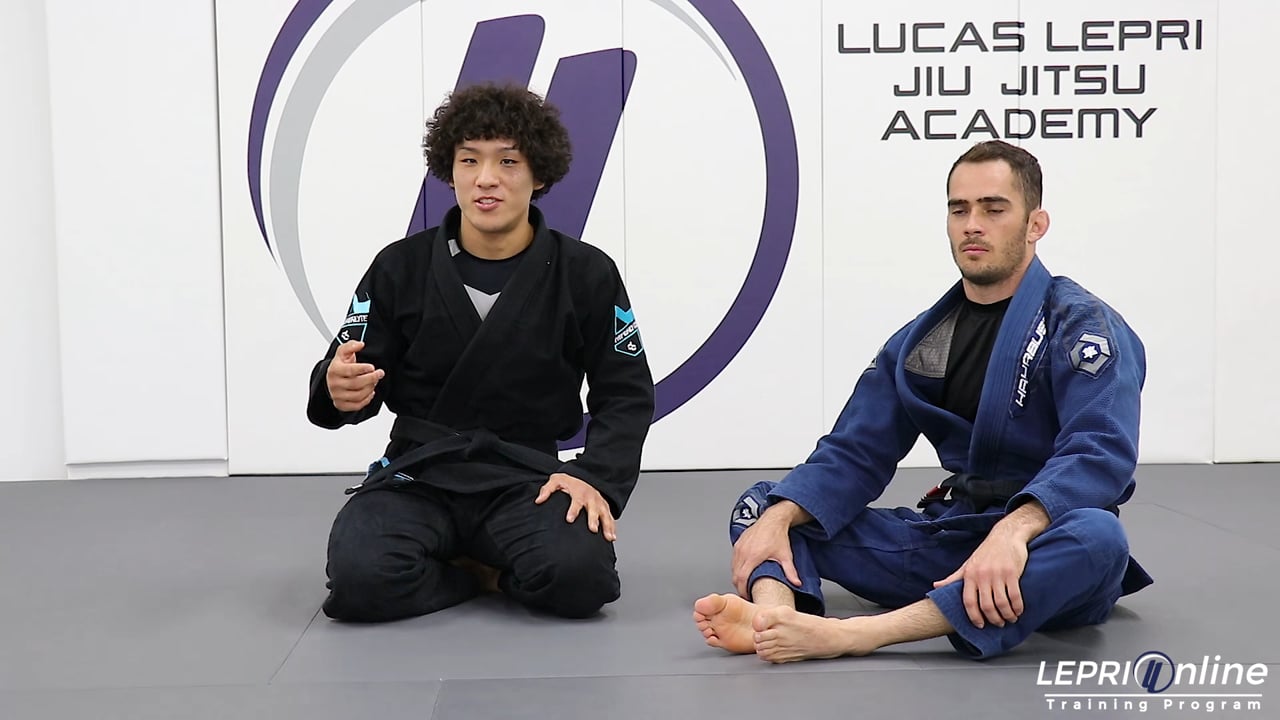 Special guest from Japan, Kenya Yamanaka, shows how to pass the sit up guard and get to the side control after defending the opponent’s sit up guard sweep attempt. The opponent is using the sit up guard and Kenya goes for the under hook. He uses his other hand to grip the opponent’s opposite side knee. The opponent tries to sweep Kenya, but Kenya uses his head to post on the mat and pushes the opponent’s head in the opposite direction. Kenya then turns his knee in and traps the opponent’s leg on the mat. He then switches his base and gets to the side control position.