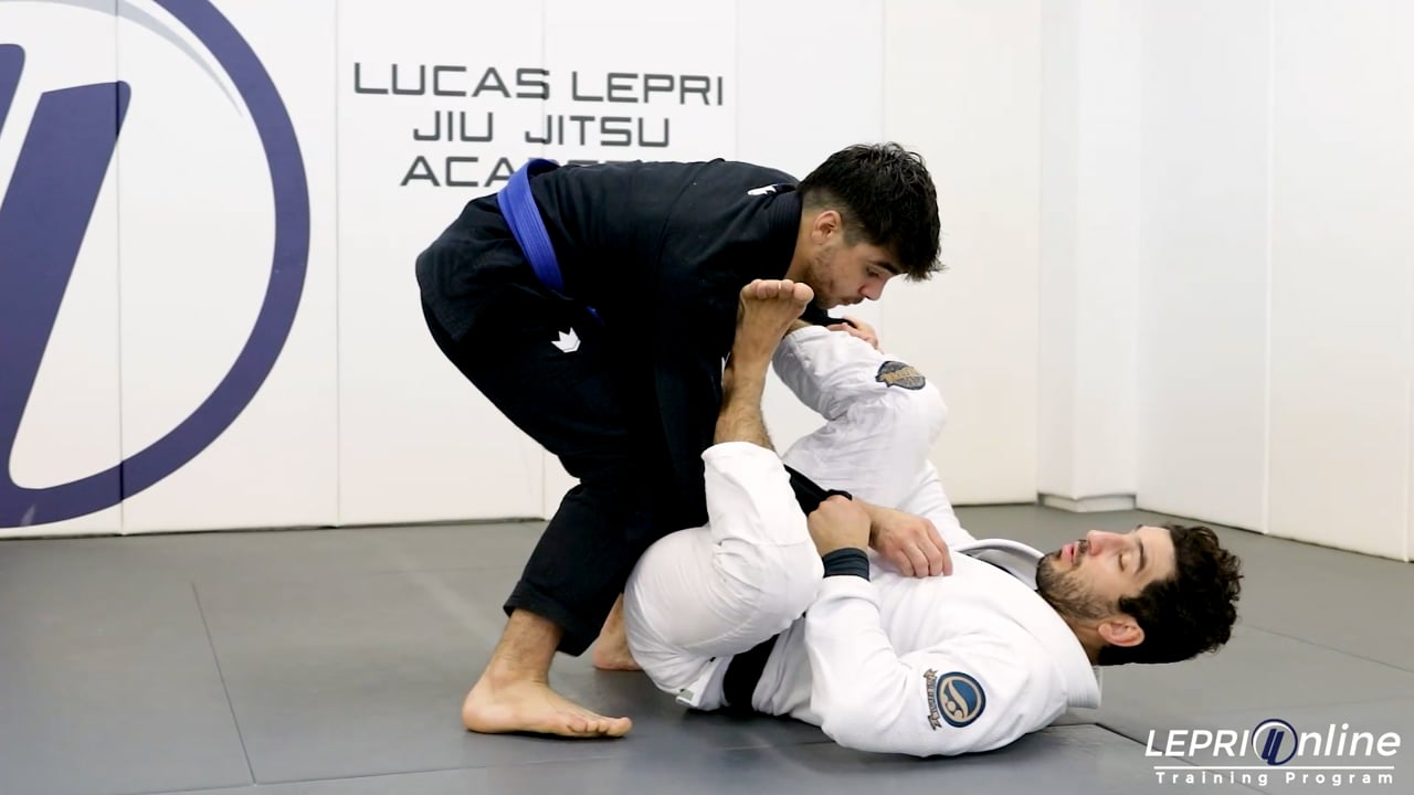 Professor Lucas Lepri teaches how to mount the opponent, when the opponent defends a triangle. Lucas starts with the open guard controlling the opponent’s sleeves so he can position himself with the spider and half lasso. The opponent starts to apply pressure in an attempt to pass. Lucas drops his lasso side leg and uses it to push the opponent's leg back. He now immediately elevates both legs over the shoulder and under the arm, locking his feet together to go for the triangle choke. The opponent reacts by sitting back and places his knee in between Lucas’ legs to defend. Lucas unlocks his legs, places one foot on the bicep and shrimps out. He slides his outside foot behind the opponent’s knee and across the body. In this variation, Lucas inverts himself going to a berimbolo spin. Half way through the berimbolo, Lucas does a back roll and goes to the mount position.
