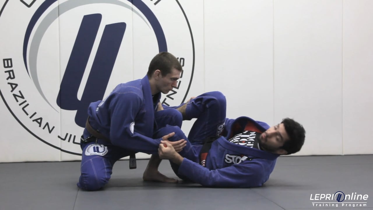 Professor Lucas Lepri teaches how to sweep using the spider and reverse De La Riva guard when an opponent is kneeling on one knee to negate his attacks from spider guard. In this situation, Lucas applies a reverse De La Riva hook to the front leg and keeps both of his grips on the sleeves. Lucas then pushes down with his foot on the bicep and uses momentum from his opponent's reaction to invert his body, extend his legs, sweep his opponent, and immediately pass into side control position.