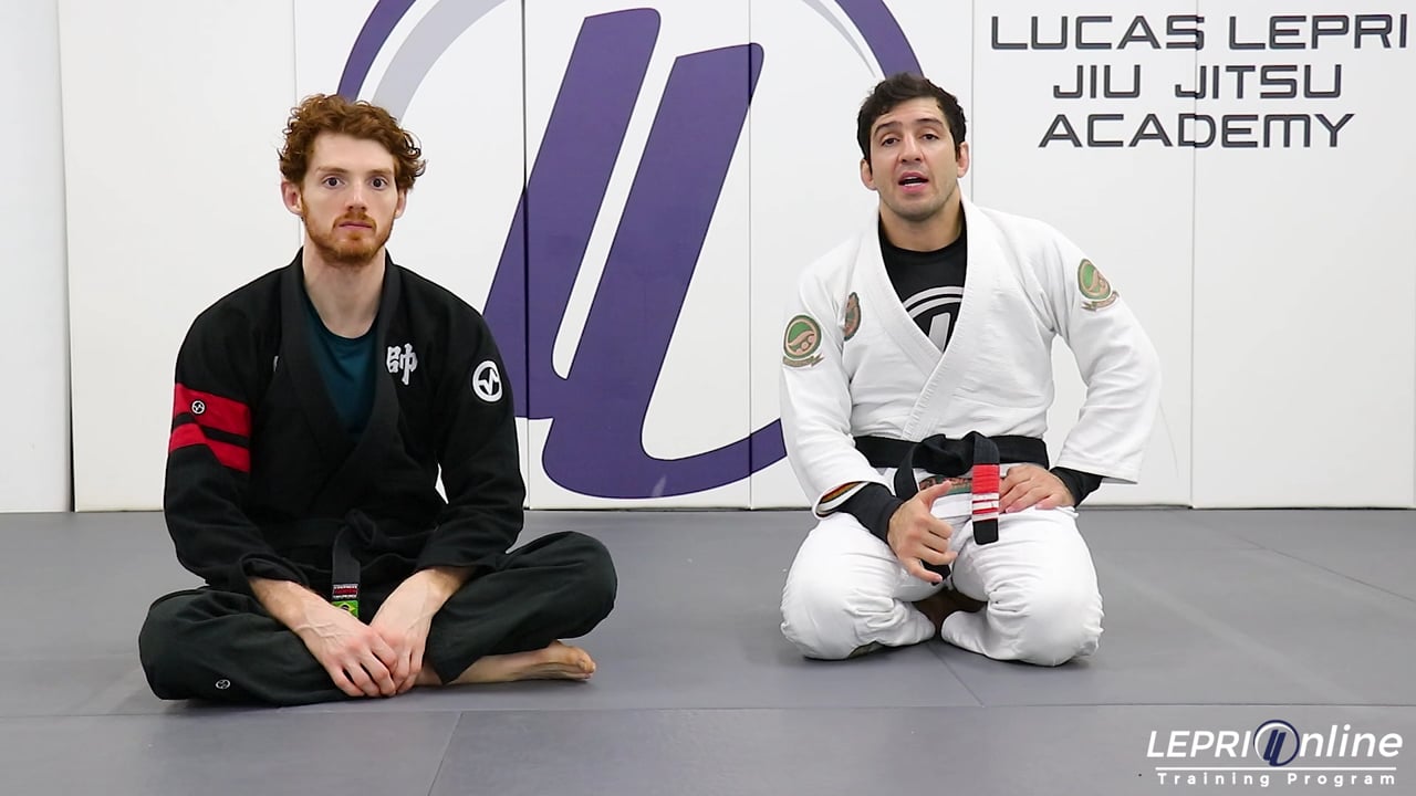 Professor Lucas Lepri teaches a variation on how to get the kimura or armbar after attempting to go for the north south position and the opponent defends. The opponent has the spider guard and Lucas starts to pass by circling one arm in and grips the pants. He now pushes both legs to the side and starts moving to the north south position. In this scenario, the opponent prevents Lucas from obtaining the position by sitting up. Lucas releases a grip on the pants so he can post on the mat. One leg is brought over the opponent’s head and the other underneath. Lucas locks his legs together and can get the kimura from this position. If the opponent bridges to escape, Lucas then slides his bottom leg out and goes for the armbar.