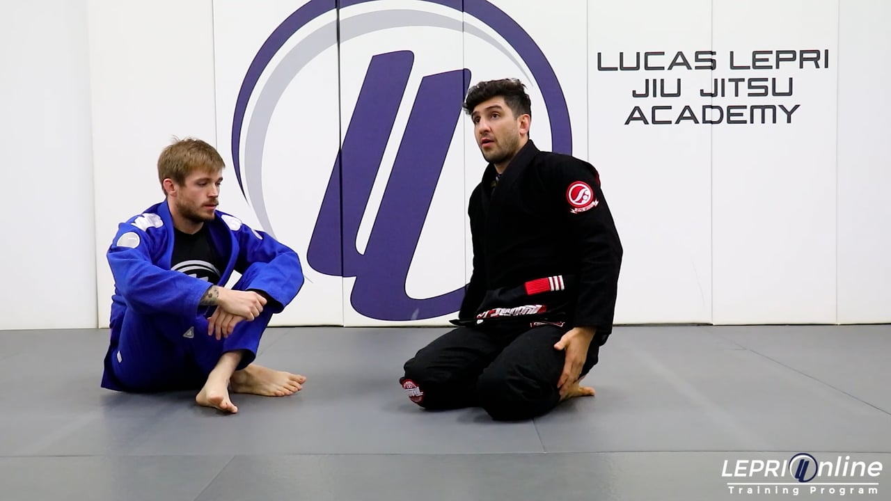 Professor Lucas Lepri teaches a drill on maintaining the spider guard. Lucas has the spider guard and the opponent is gripping the pants. The opponent throws the legs to the side to the point where Lucas’ feet come off the biceps. Lucas spins on his hips and recomposes the guard. If the opponent throws the legs and Lucas is able to keep one foot on the bicep, Lucas can use that foot to help him turn his hips and recompose.