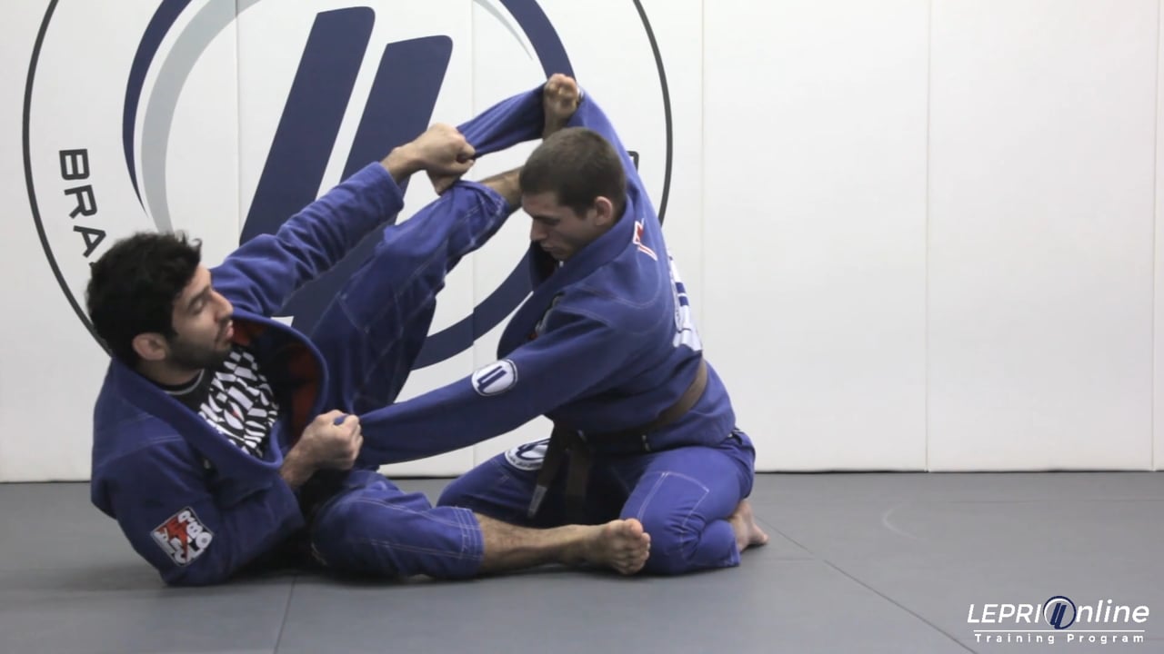 Professor Lucas Lepri teaches how to sweep an opponent from spider guard when the opponent resists his initial sweep attempt. When the opponent creates a heavy base to defend against the first sweep attempt, Lucas repositions his leg from blocking the knee to pushing the knee to eliminate the opponent's strong base. Lucas finishes the sweep by shifting his hips closer to his downed opponent and moving into the mount position.