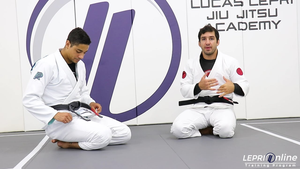 Professor Lucas Lepri teaches how to get to the side control, after preventing a sweep from the opponent, when the opponent recomposes and tries again. The opponent starts in the spider guard and then releases one sleeve so he can grip the lapel. He then pulls Lucas to unbalance so he can sweep or transition to a submission. Lucas immediately reacts by posting on the mat with his hand and walks to the side pulling the opponent’s leg down. In this scenario, the opponent is able to recompose and face Lucas. He once again tries to sweep Lucas, but this time, Lucas prevents it by placing his foot on the hips. This stops the opponent and then Lucas goes for the knee on belly.