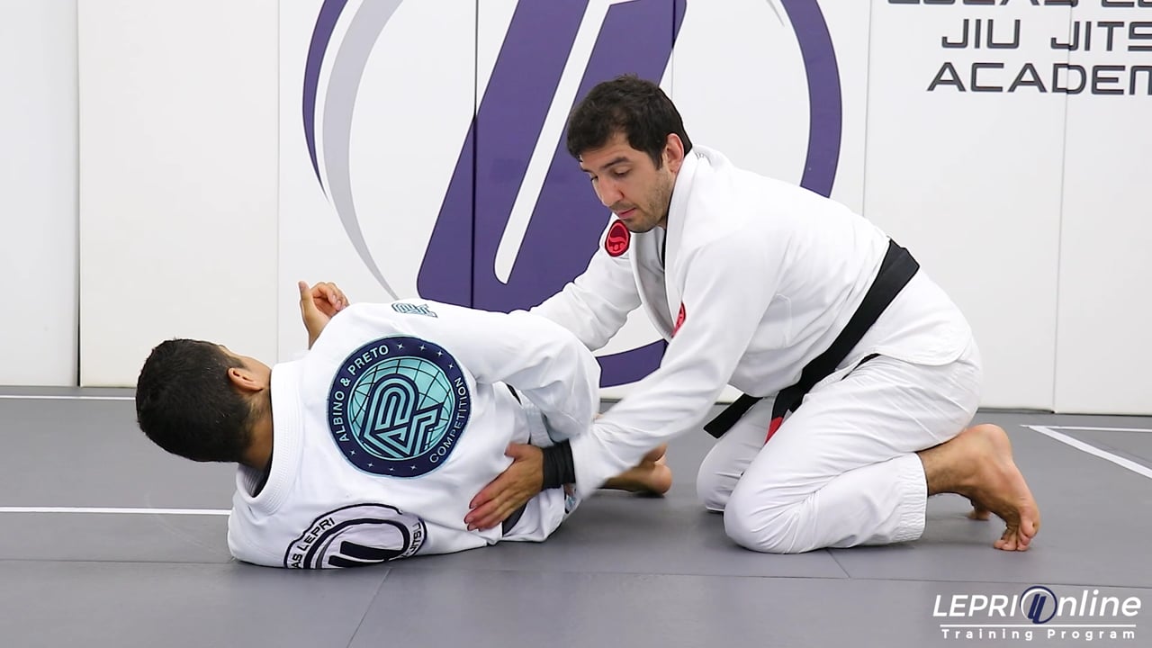 Professor Lucas Lepri teaches how to prevent the opponent from sweeping or transitioning to a submission form the spider guard. The opponent starts in the spider guard and then releases one sleeve so he can grip the lapel. He then pulls Lucas to unbalance so he can sweep or transition to a submission. Lucas immediately reacts by posting on the mat with his hand and walks to the side pulling the opponent’s leg down. He then moves to the other side and grips the arm as he transitions. From here, Lucas uses pressure to make the opponent break the grips. He then transitions to the side control or the back take, depending on the opponent’s reaction.