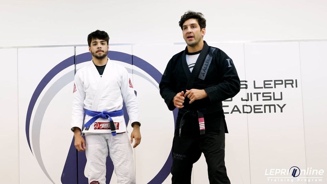 Professor Lucas Lepri teaches how to take the opponent down using the collar drag. Lucas starts standing and controls the sleeve and the same side collar. He uses his elbow to block the opponent as he stays in line with him. Lucas now steps to the side and drops his foot to trip the leg, as he pulls the collar down to take the opponent to the mat. As the opponent hits the mat, Lucas releases the grip on the sleeve and grips the bottom leg applying pressure with his body. Lucas now walks around and gets to the side control.