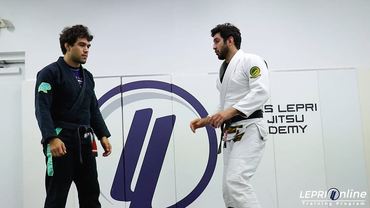 Professor Lucas Lepri shows how to get an armbar, after attempting to sweep the opponent from the de la riva while having the lapel control. While standing, Lucas is controlling the arm and reaches for the lapel with his other hand to pull it out. He places the foot on the hip and drops down to the de la riva position while maintaining the lapel control. Lucas now sits up and feeds the lapel behind the leg to his other hand and goes back to the de la riva position. He adjusts his hips to the side so he can extend his near side leg out and reaches under the leg to switch the grip on the lapel to his other hand. Lucas raises his hips so he can place his leg over the opponent’s knee. He turns to the side and attempts to sweep the opponent, but the opponent defends by gripping the collar. Lucas now brings his outside leg in and uses the momentum to spin under the opponent. As he spins, he brings his leg over the head for the armbar. Lucas finishes the armbar by continuing to spin, flipping the opponent over. This same scenario can also be done if the opponent grips the pants instead of the lapel.