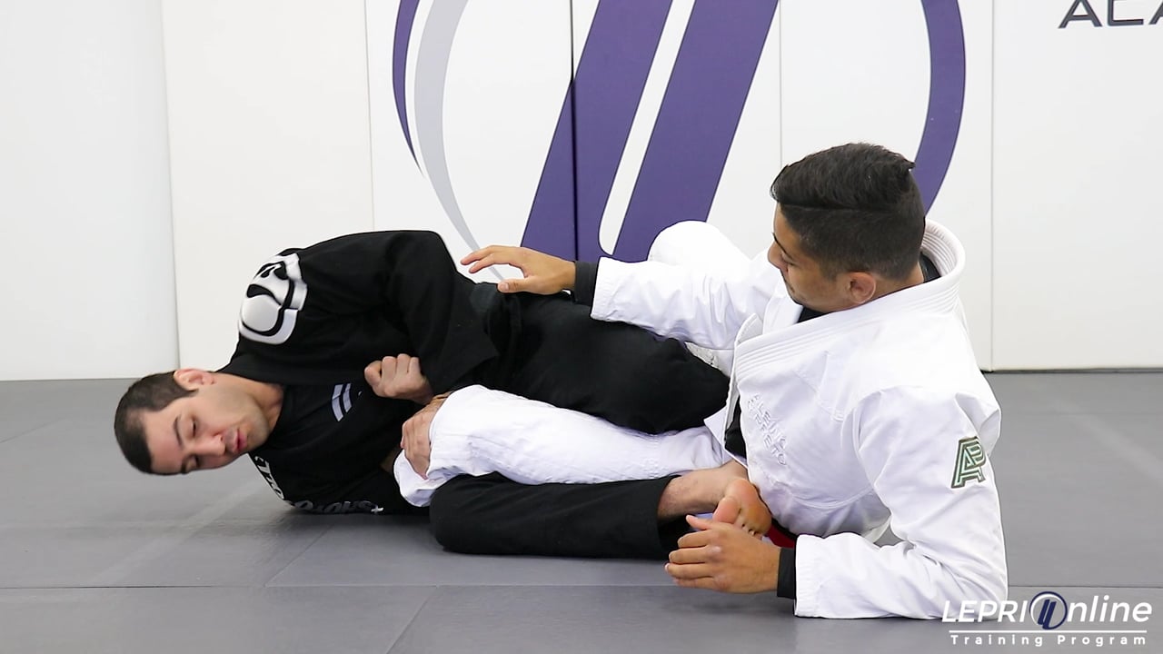 Professor Lucas Lepri teaches how to get the straight ankle lock while standing. Lucas is standing and the opponent is on their back. The opponent now places his foot on Lucas’ hip. Lucas reaches under the ankle and locks his arms together. He now steps forward and raises his hips to elevate the ankle to get the straight ankle lock.