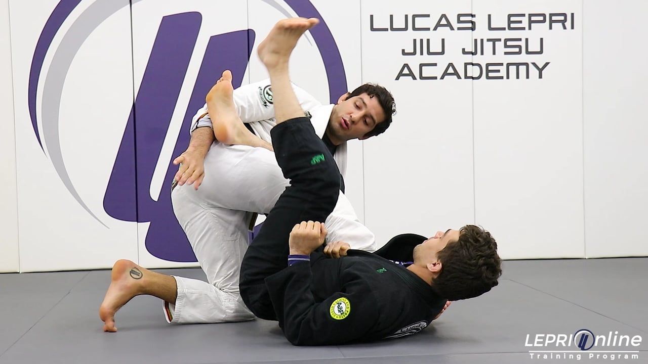 Professor Lucas Lepri teaches how to escape from the straight ankle lock while in the 50/50 guard. The opponent locks the straight ankle and controls his own collar. Lucas immediately starts to come up and places his free knee on the mat. He under hooks the opponent’s leg and controls the knee. In this scenario, the opponent reacts by hooking Lucas’ leg with his foot. Lucas immediately stands up and pushes down on the foot to remove the hook. He now pushes both legs down and steps back to escape.