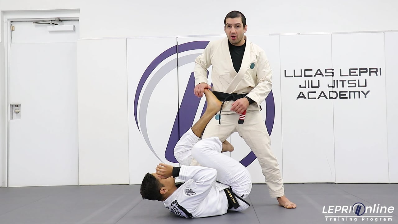 Professor Lucas Lepri teaches how to escape from a straight ankle lock attempt, when in the one leg x. Lucas starts to defend by gripping the bottom leg and places his other hand on the foot. He pushes down on both and turns his knee in. The hand that was on the foot is now placed on the mat near the opponent’s head. Lucas now back steps as he pushes the leg down. He controls the hips and then transitions to the side control.