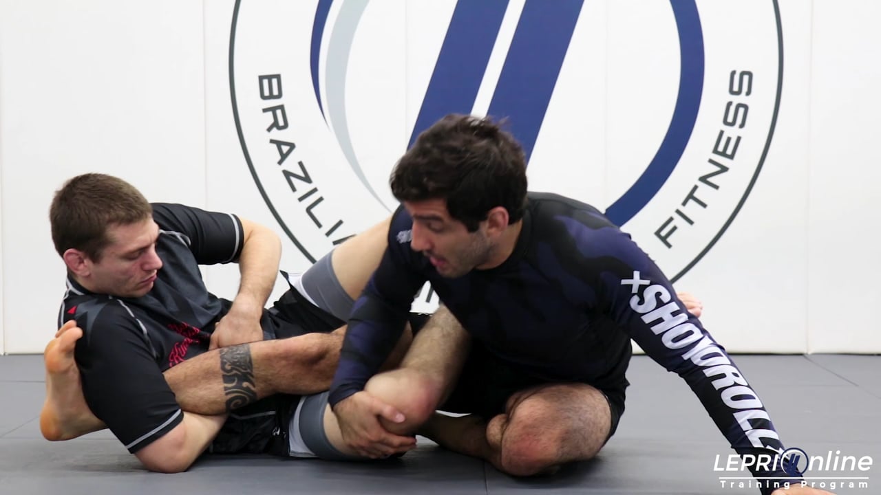 Professor Lucas Lepri shows an ankle lock defense from the 50/50 guard. Lucas and the opponent are both in the 50/50 guard and the opponent tries to go for a straight ankle lock. As soon as the opponent goes for the ankle lock, Lucas reaches for the opponent’s knee and starts pushing him to the other side by opening the knee. As he opens the knee, he hides his free foot underneath the opponent’s leg and makes sure he keeps his other leg extended. Lucas then switches the grip on the knee and uses his free hand to post on the mat. Lucas then postures up and uses both hands to push the opponent’s legs away from him. In this situation, as soon as Lucas starts to posture up, the opponent prevents him from doing so by using his outside leg to block Lucas’ free leg. Lucas responds by underhooking the opponent’s leg. Using his arm to post on the ground, Lucas lifts his free leg and puts it in between his opponent’s leg and turns his body forward, placing both knees on the mat and lowering his hips to complete the ankle lock.