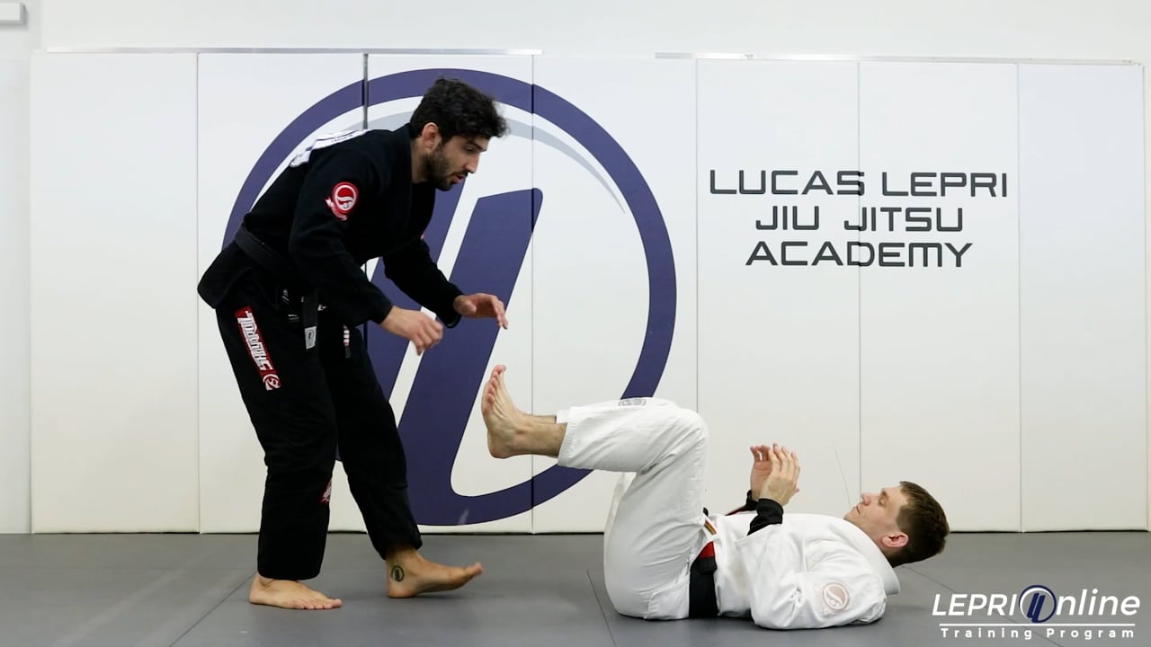Professor Lucas Lepri shows a drill starting with the toreada pass grip. Lucas is gripping the pants and then pulls the legs to the side so he can go for a knee cut. As soon as he starts sliding the knee, he shifts his hips posting his legs back and out and immediately clubs the back. From here, Lucas re-sets and repeats the drill side to side.