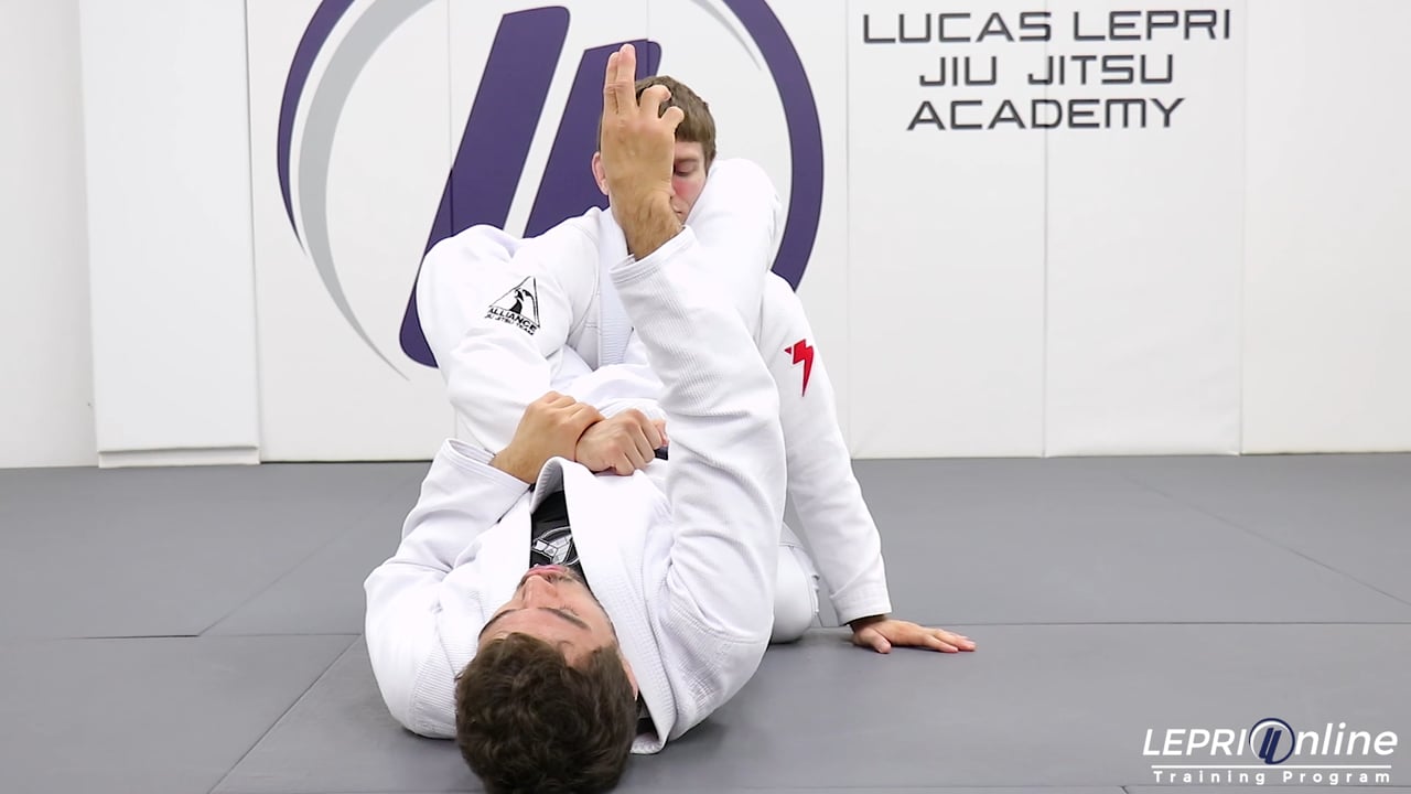 Professor Frederico Silva teaches how to submit the opponent with a triangle choke from the closed guard. Frederico has the opponent in his closed guard and controls both of the sleeves. He pushes one arm in between his legs as he raises his hips to cross his feet together over the opponent’s back. Frederico brings the other arm across and then lowers his hips. He then locks his legs in a figure four and squeezes his legs together to get the triangle choke.