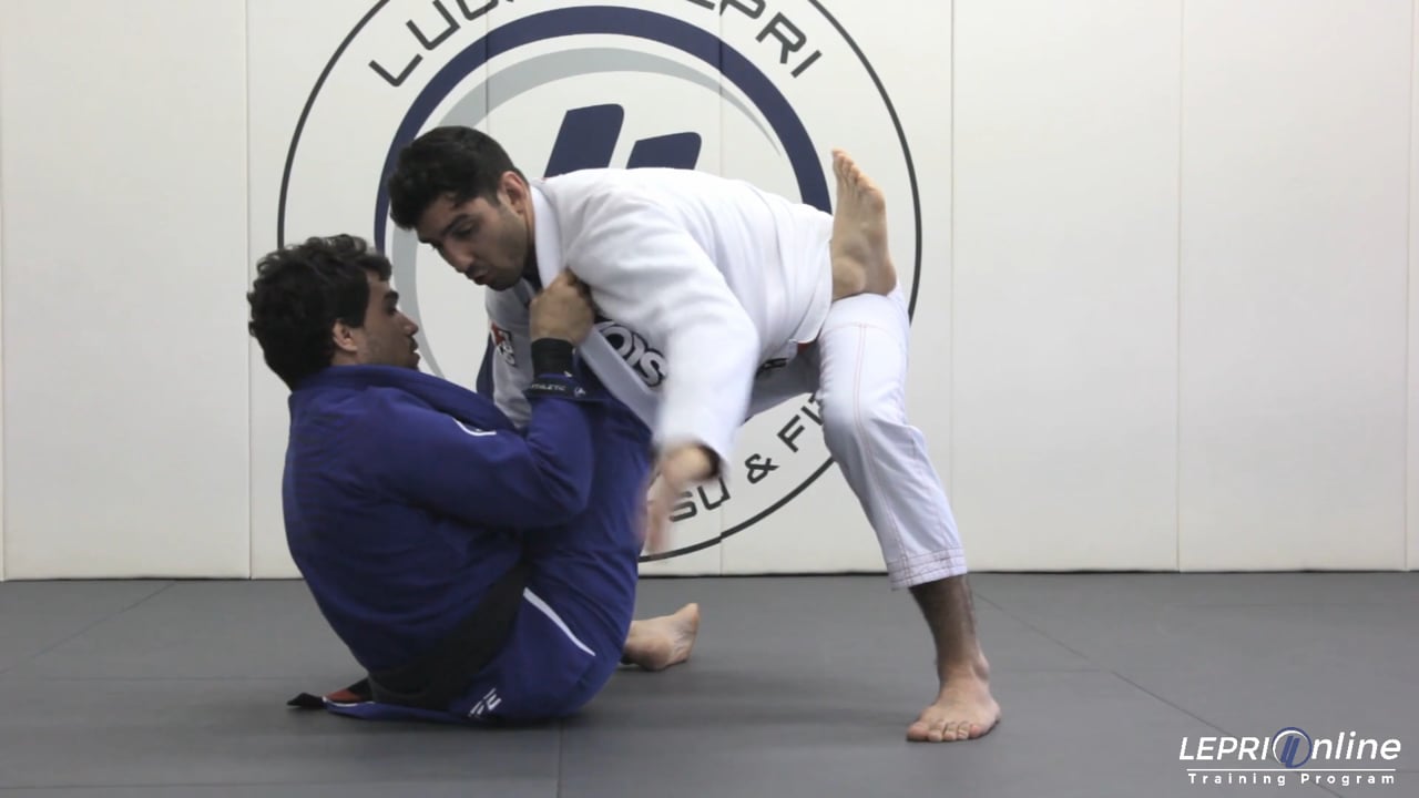 Professor Lucas Lepri teaches how to escape from the worm guard when the opponent feeds the lapel behind his leg. The situation begins with the opponent in De La Riva guard gripping Lucas' ankle and lapel. In this sequence, the opponent is able to sit up, feed the lapel behind Lucas' leg, and grip with the other hand on the same lapel. Lucas first controls the opponent's lapel and, if necessary, he clears the opponent's foot from his hip. He then switches his grips, controlling the lapel with one hand and driving the opponent's leg down to the mat with the other. From here Lucas grabs the tail end of the lapel to break the opponent's grip, escaping from the worm guard and putting himself in position to apply the knee cut or toreada pass.