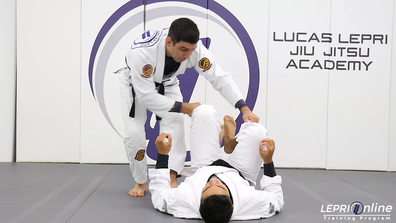 Professor Lucas Lepri shows a drill on the x pass. The opponent has the back on the mat and legs up. Lucas is standing and grips the top of the legs. He starts stepping to the side as he pushes the same side leg back. He now brings his other elbow over the leg to lock the knee, forming and x with his arms. Lucas now resets and goes to the other side. He now goes back and forth.